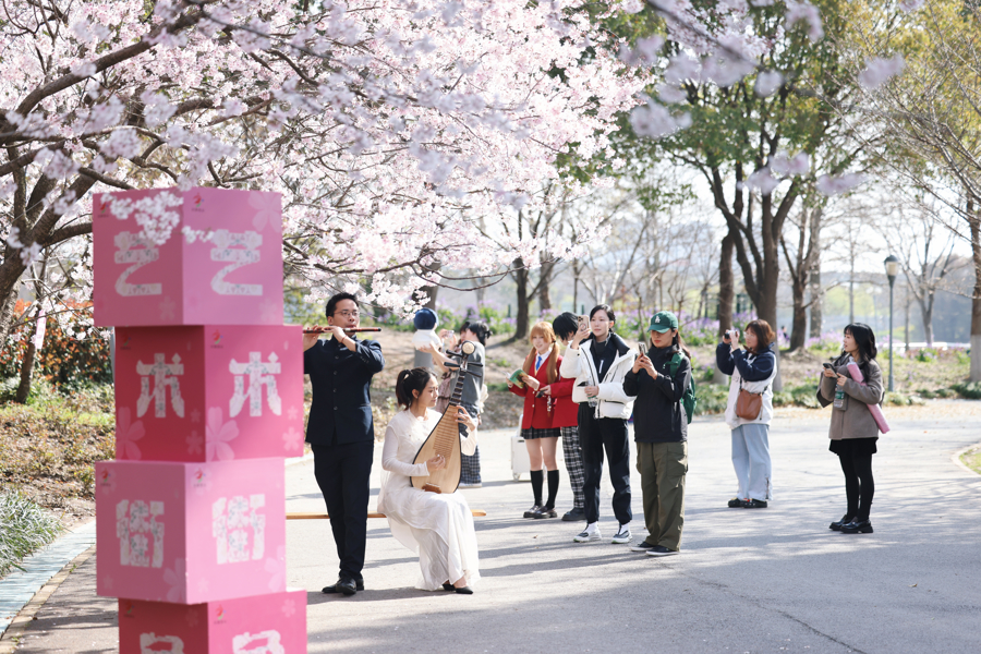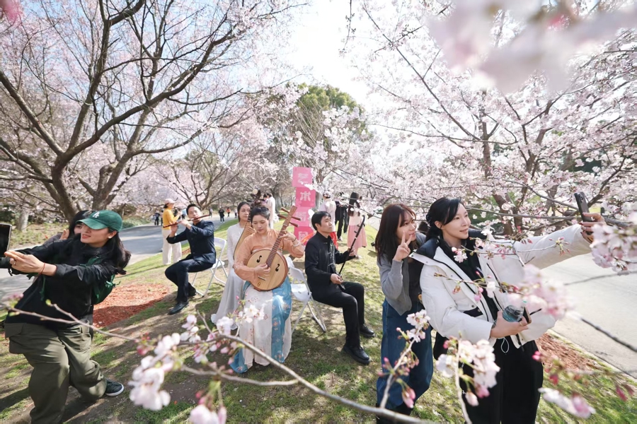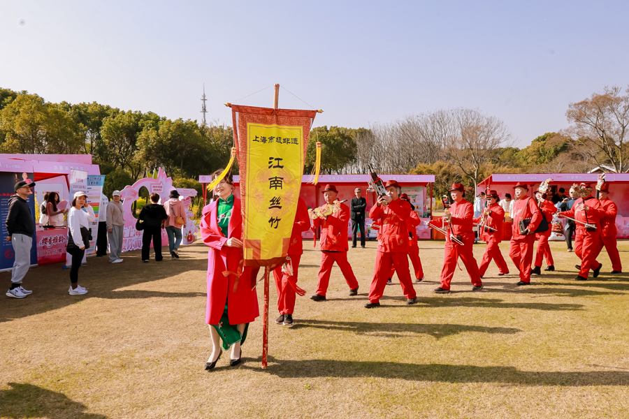 春日的顾村公园,樱花烂漫。“堆云叠雪”之时,上海市江南丝竹雅集在这里举办了全年首场活动——“春和景明·清音启岁”。千余人或安坐于席,或驻足于侧,或闲步于庭,于落“樱”缤纷处赏听清音雅乐。