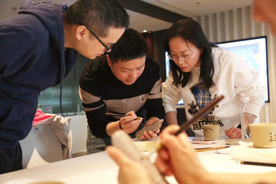 当天,长宁区虹桥当代艺术馆的“陶铭心印”紫砂书法镌刻工作坊则首次走进“城市疗愈酒店”——上海阿纳迪酒店,探索“文化+商业+旅游”的新场景、新模式。宜兴紫砂国家级工艺美术师王依娇、国家级工艺美术师钱伟刚等现场坐镇,指导20名市民游客从书法起稿到运刀镌刻,在120分钟的时间里完成属于自己的文人紫砂作品,亲身体验“以刀代笔、以陶为纸”的独特艺术魅力。活动还联动长宁文化艺术中心的“最美身边人”粉画人物写生、当代版画艺术中心的“马拓春晖”丝网版画体验,以“非遗传承+当代艺术+沉浸体验”,打造可参与、可感知、可带走的春日美育体验。